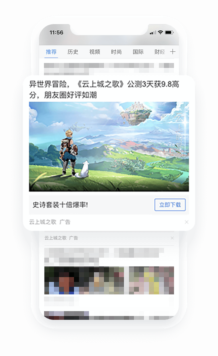 以信息流形态展现的⼴告,良好的阅读体验和⽤户的⾼注意⼒能使⼴告获得有效的营销效果,是⼀种强曝光的⼴告形态。